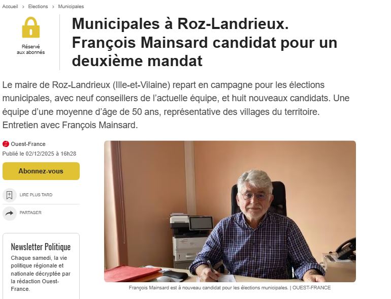 Un article vraiment inspirant sur la démarche de François Mainsard, maire de Roz-Landrieux, qui met en lumière une véritable volonté de continuité, un attachement au concret et une expérience solide